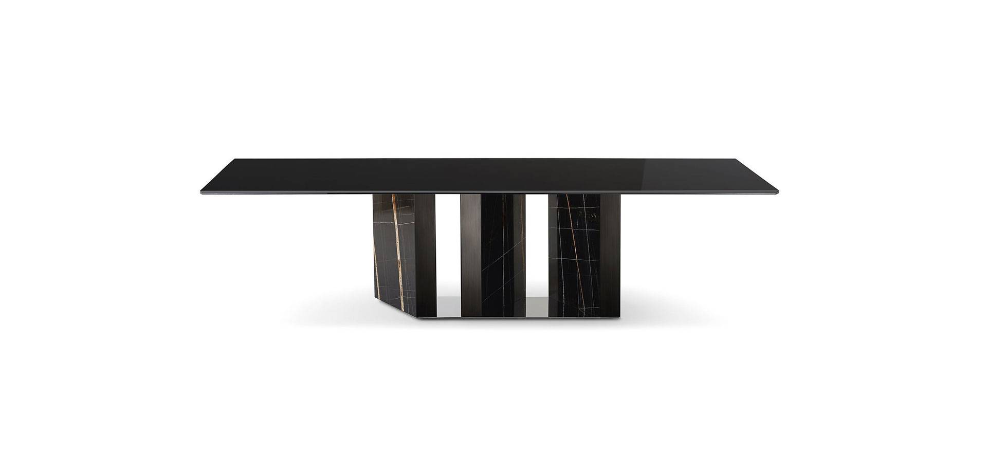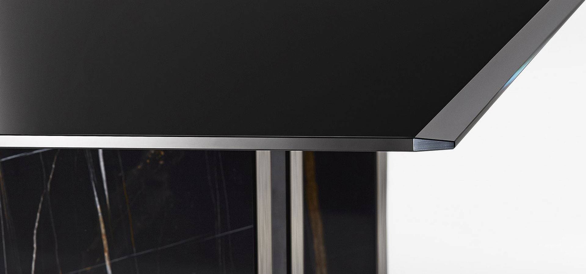Table with a 15mm black painted glass top available in two finishes: brilliant and satin. Two sides of the top have 4cm bevelled edges. 20mm Sahara Noir marble on a wooden base with a "supermirror" bright stainless steel bottom plate. Also available with a 15mm glass top and a 6mm painted glass base in the colors black, blue grey, or liquorice, in the bright or satin finish, or painted with the distinctive "Cashmere" brushed finish in gold grey or anthracite.
