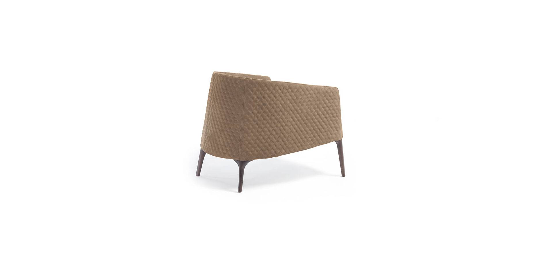 With a truncated cone form and a backrest that slopes softly towards the armrests, the Poggi armchair is a true passe-partout that adds refined elegance to both a living and sleeping room. The sartorial features of the external section of the backrest, with quilted inserts, improve the shapes for a pleasant touch, while the solid wood feet with a material effect raise the armchair for a light visual effect.