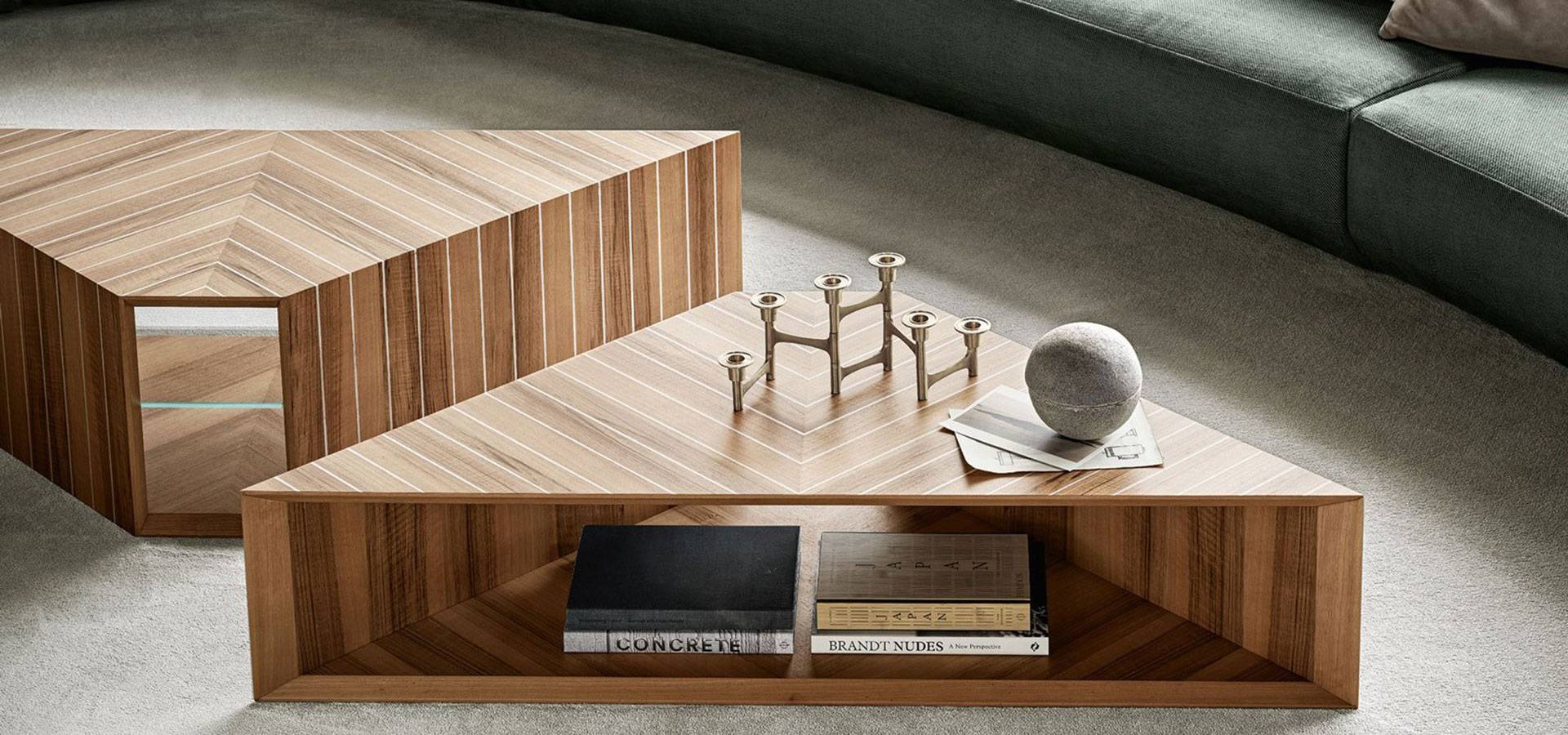 Marquetry of "Color" Frisè Walnut and natural aluminum or India Rosewood and natural aluminum on a wooden coffee table. Inside shelf is 8 mm thick extralight tempered in the 37 cm high variant. 40/47 cm h. Natural brushed Travertino Romano (not treated with resin) or natural gloss Verde Alpi marble are both options.