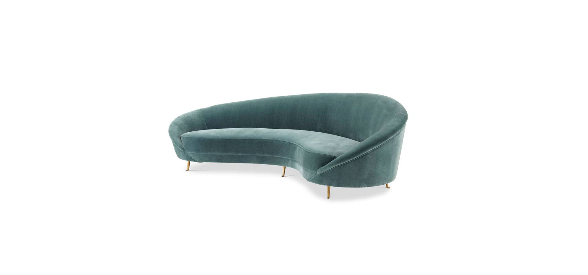 Relax to the max on the velvet soft Provocateur Sofa. Enjoy the supreme comfort and vintage charm of this curved asymmetric couch with Cameron deep turquoise velvet upholstery and elegant tapered brass feet.