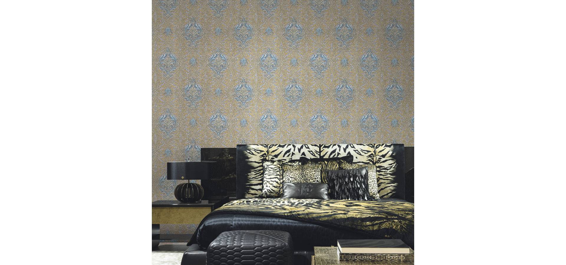 A striking heavyweight Italian vinyl wallpaper with an ornate damask design on top of a fake animal print. Contrasting blue and gold are shown here. This is a design with an exceptionally broad breadth.