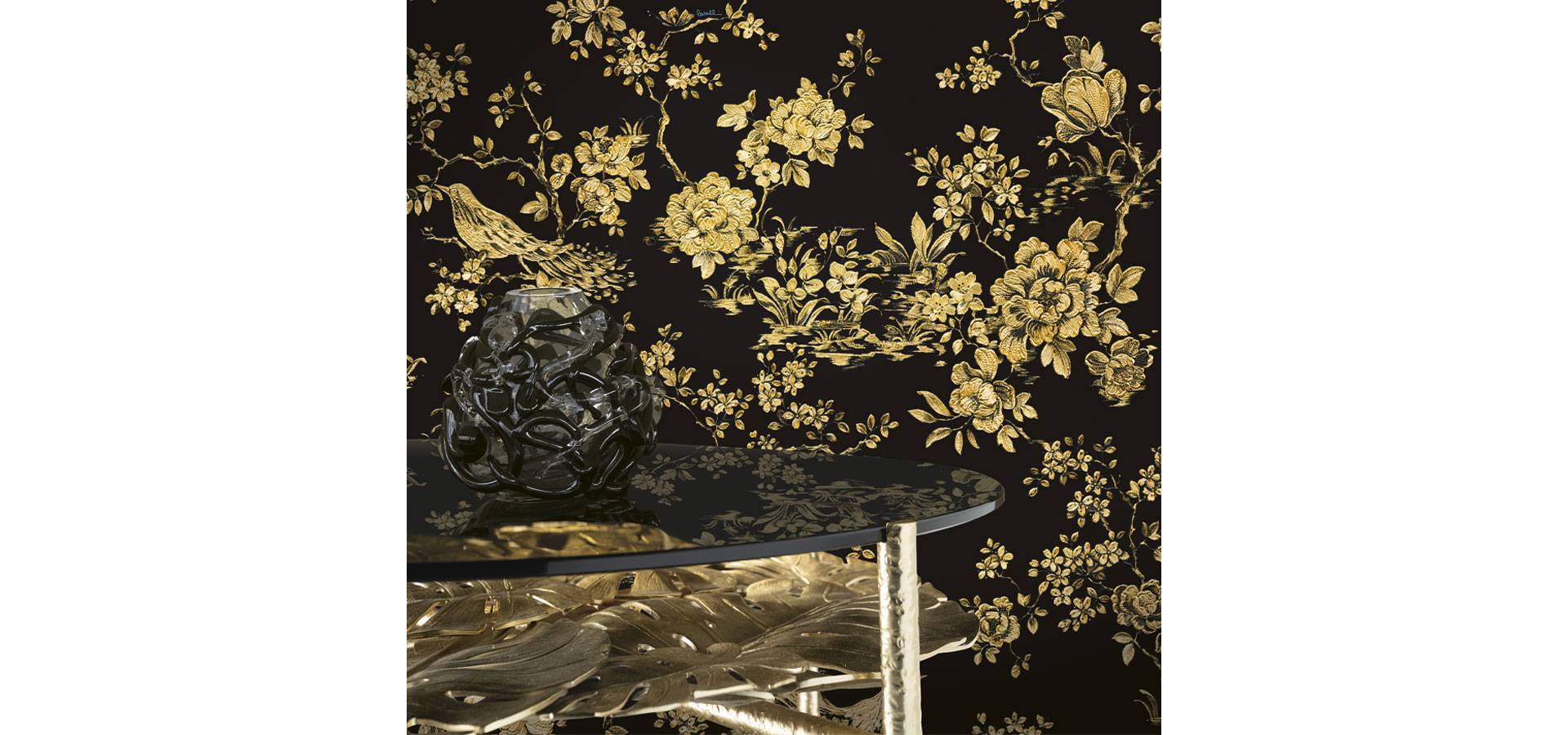 Black wallpaper with tree flower leaves and birds in gold colour that can help you create a soothing elegant luxury feeling in any room.