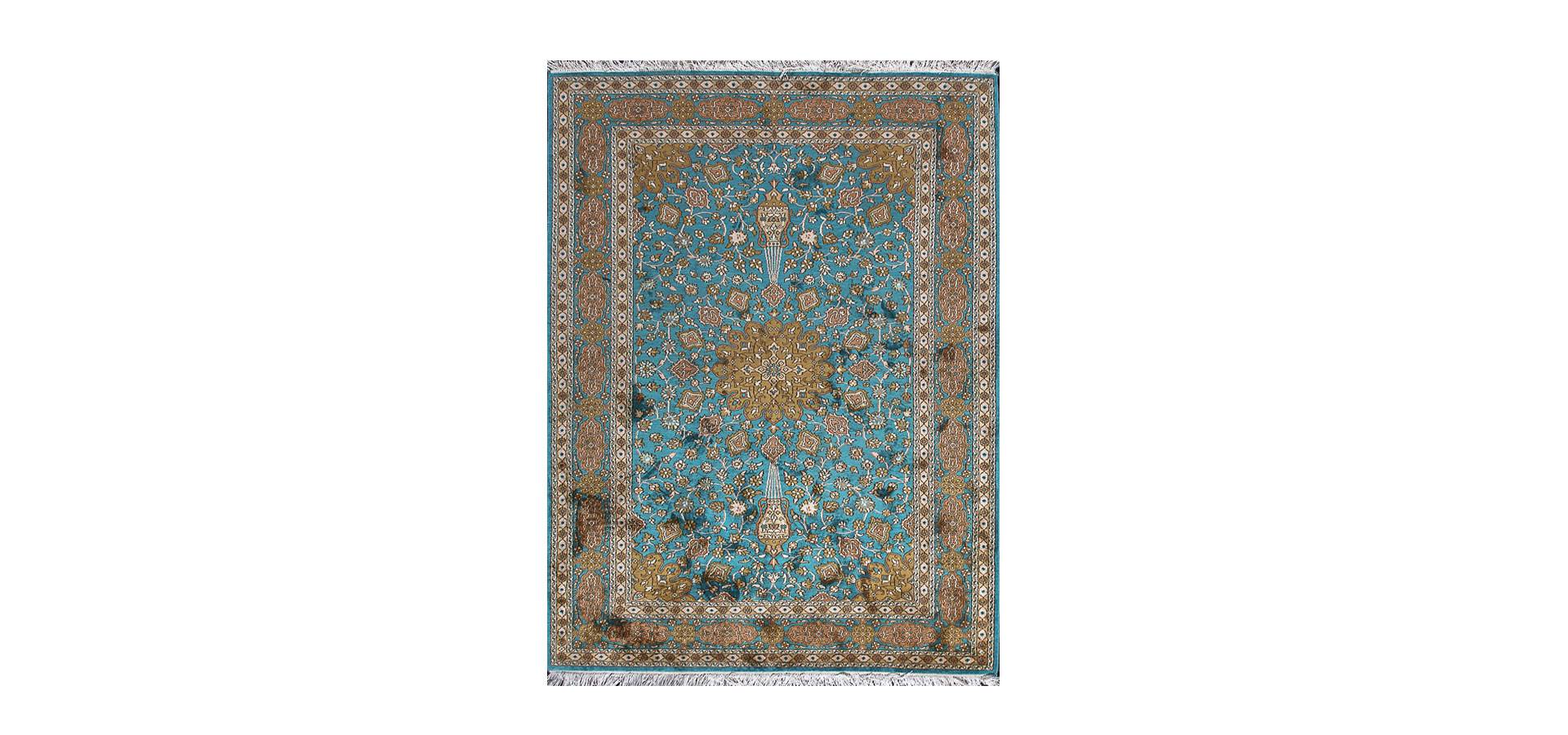 A very fine silk carpet in a lovely torques color with a traditional oriental design. Suitable for a classic or modern setting, or as a wall decoration