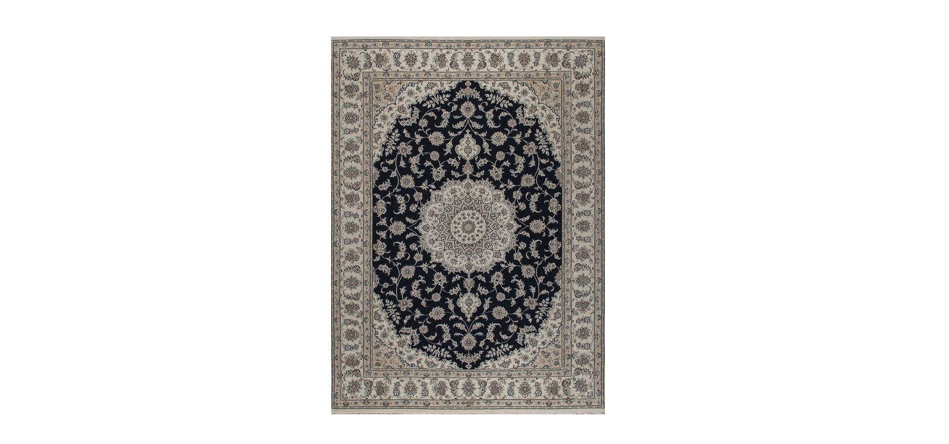 A very fine and rear Nain silk carpet in a lovely navy blue color and with a traditional oriental design. Suitable for a classic or modern setting, or as a wall decoration