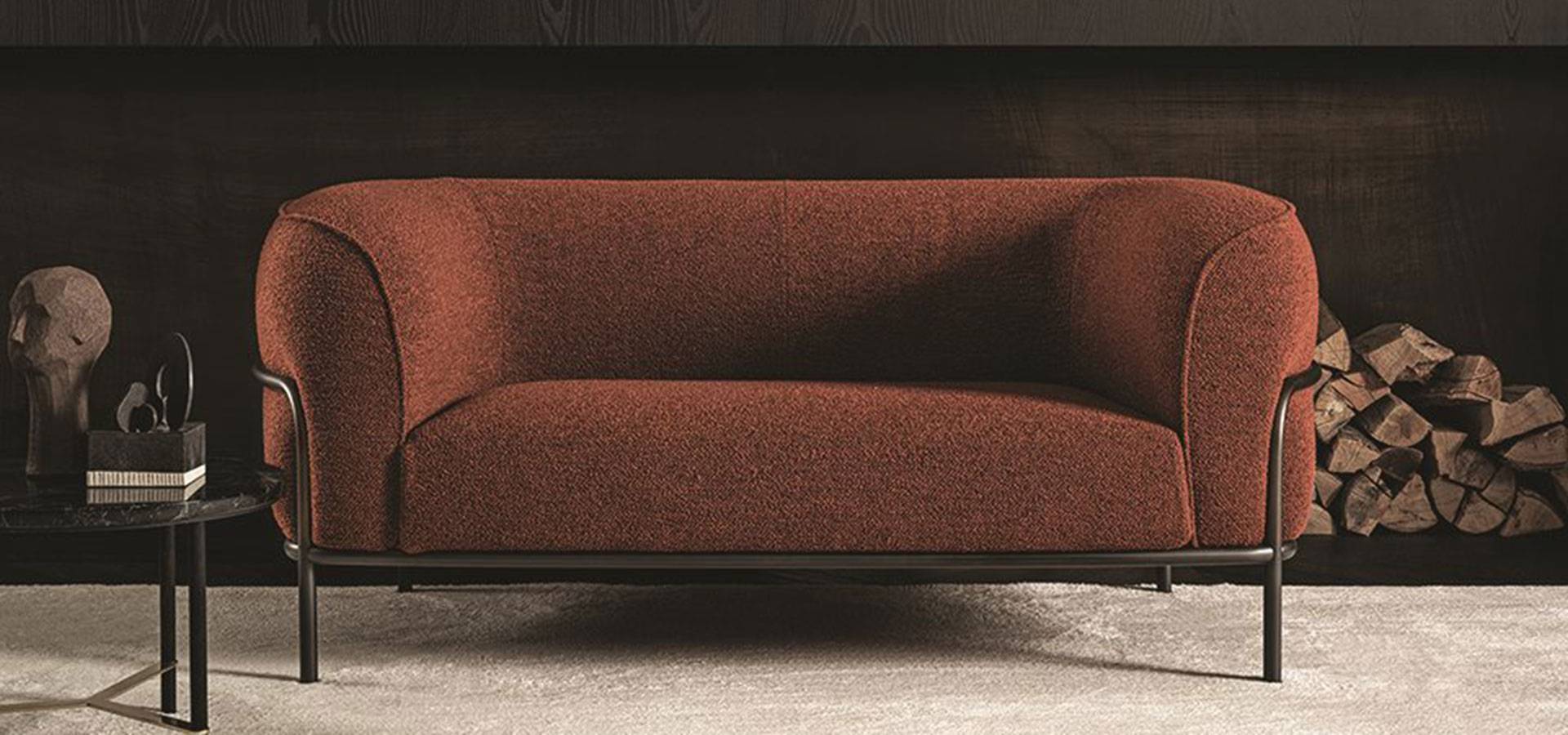 Small sofa with polyester fiber padding and non-deformable polyurethane foam in various densities. Removable fabric cover in the same colors as the samples. Satin brass or anthracite gray lacquered metal structure.