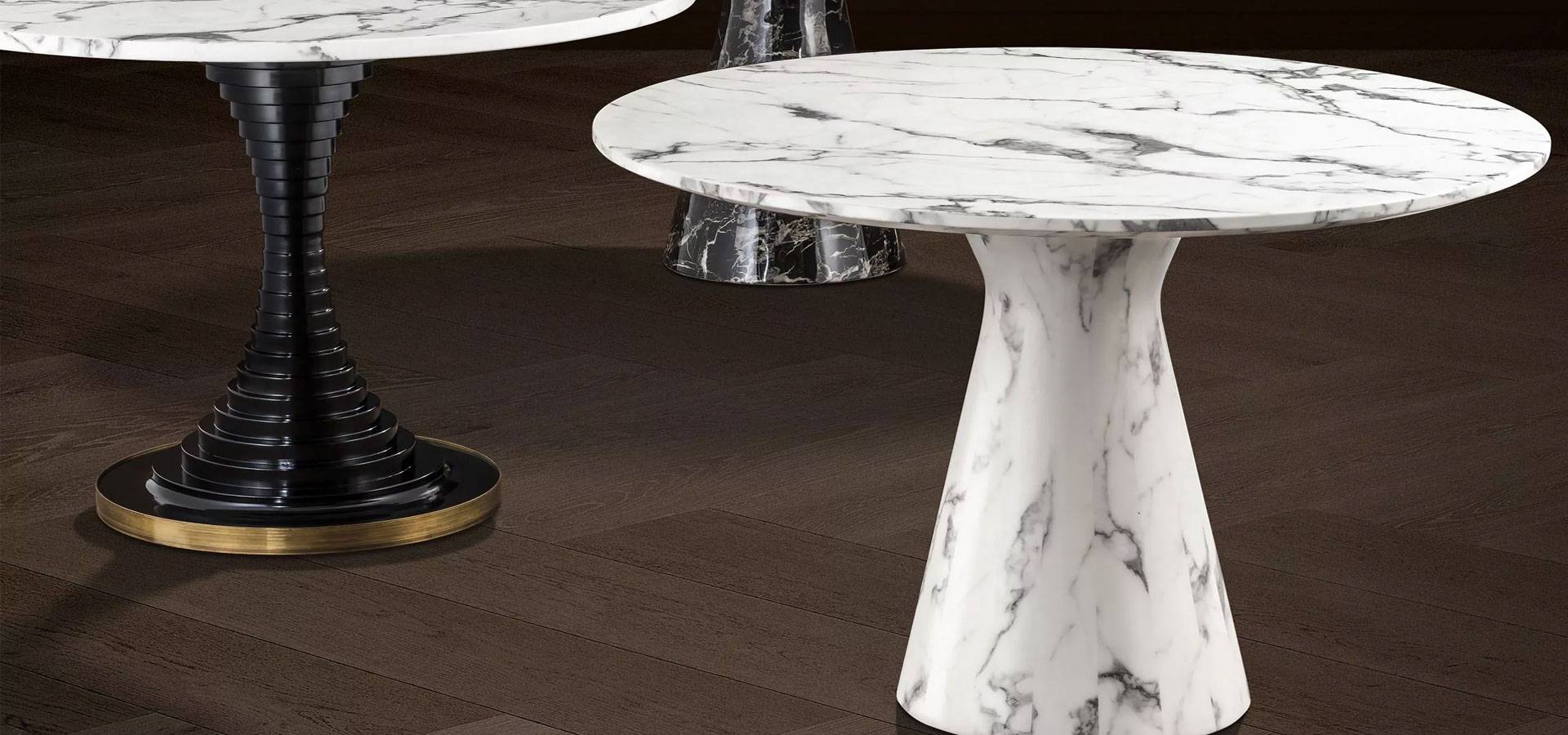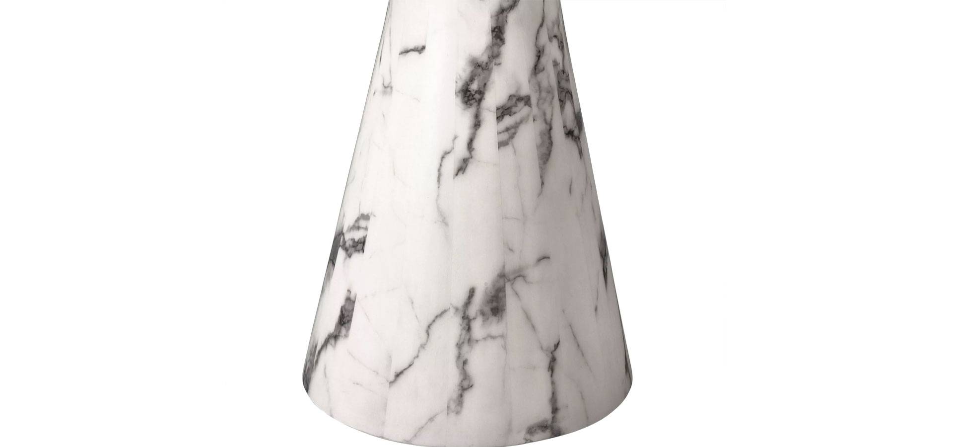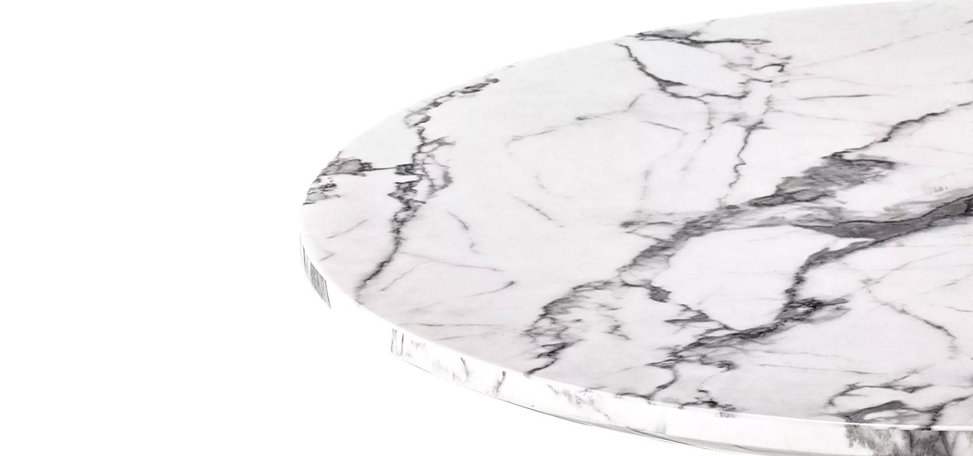 The stunning Turner Dining Table is made of white faux marble and features distinctive black swirls and veins.