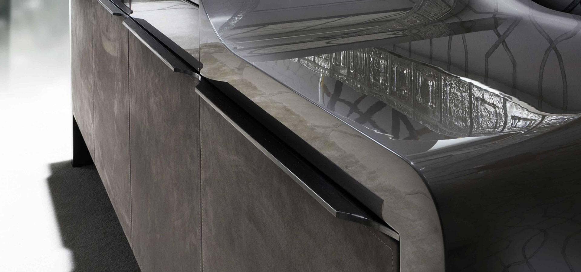Natural protected nubuk leather buffet with marble top and high gloss polyester grey lacquer construction.